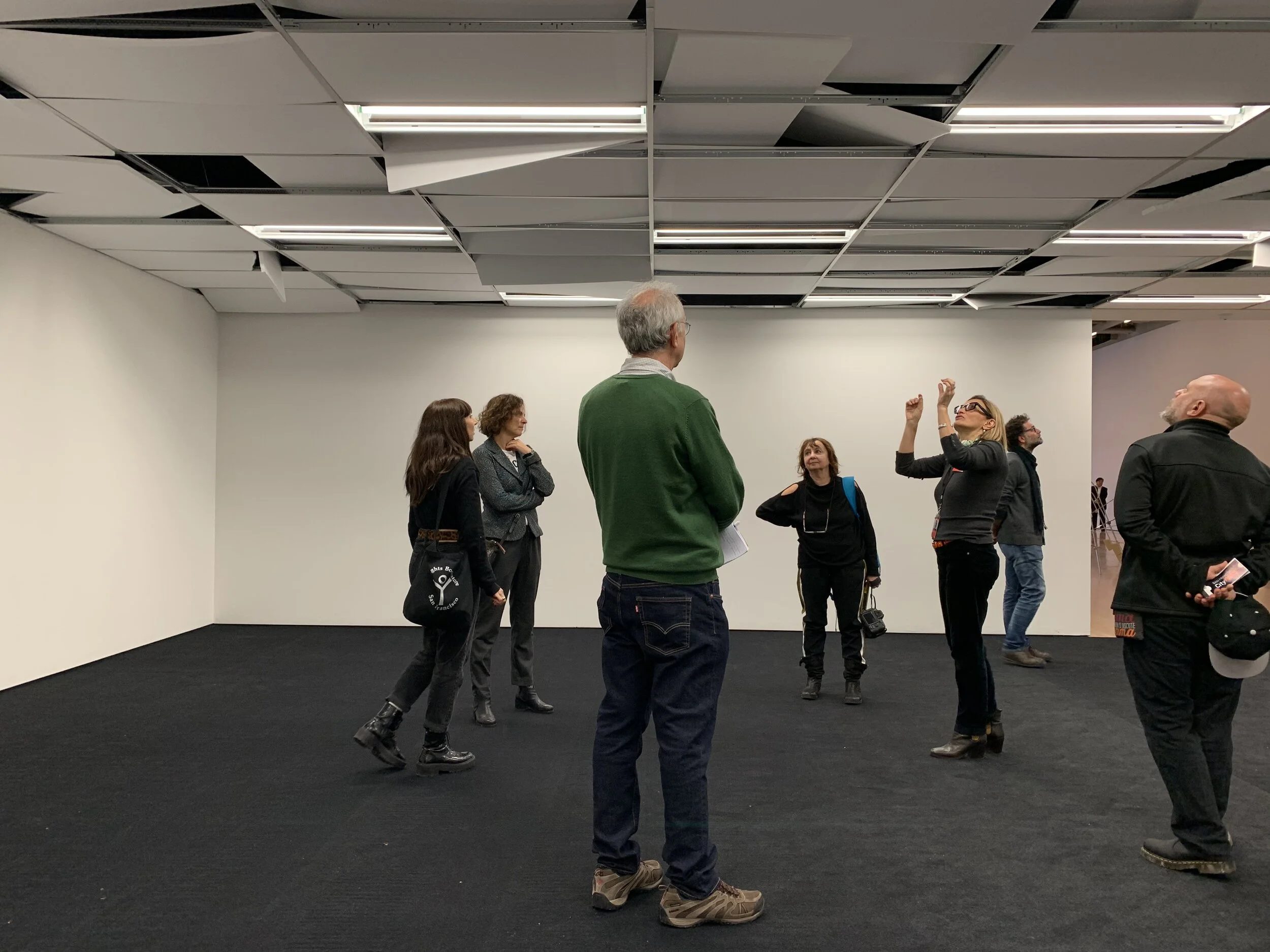 An Italian speaking docent leads a tour through SOFT POWER, gesturing towards a drop ceiling falling apart, and says something I imagine is similar to the didactic text. The ceiling represents the patriarchy and it is broken. This factually sound and conceptually underwhelming conceit in Cinthia Marcelle’s There is No More Place in This Place 2019 opens the exhibition on the first of two floors in SFMOMA.